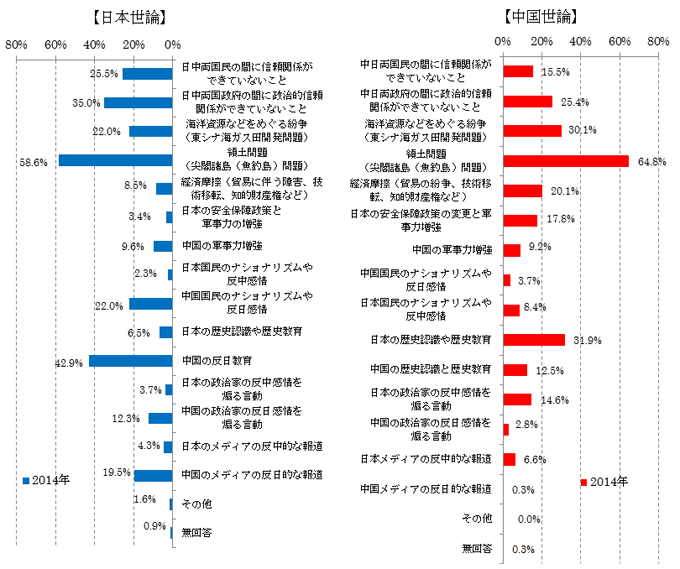 日中両国民が考える日中関係の最大の懸念材料としては、政府間や国民間に信頼関係がないことを挙げる人が、両国に目立ち始めています。日本人で最多の回答は「領土問題」で、これが58.6%で突出しています。ただ、「日中両国政府の間に政治的信頼関係がないこと」も35%と4割近くになっているほか、「国民間に信頼関係がないこと」を指摘する人も25.5%あり、合わせると6割の日本人が政府や国民間に信頼関係がないことが、関係改善の障害と捉えていることになります。中国人でも、「領土問題」が懸念材料と考える人が64.8%で最多となりました。ただ、日本と同様に、中国でも政府や国民レベルの信頼関係がないことを関係改善の障害と見ている人は少なくなく、「政府間の信頼関係がないこと」は25.4%、「国民間に信頼関係がないこと」を障害と見る人は15.5%となり、合計すると4割を超えています。