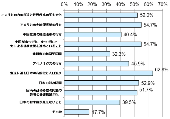今、日本の将来や日本を取り巻く状況の変化で気になっていることを尋ねたところ、最も多くの人が「急速に進む日本の高齢化と人口減少」(62.8%)と国内の状況の変化を挙げ、「アメリカ大統領選の行方」、「中国が南シナ海、東シナ海で力による現状変更を進めていること」で54.7%の同率で続きます。