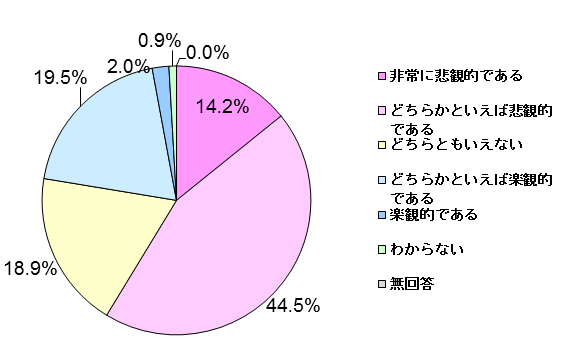 一方、「楽観的である」(2.0%)、「どちらかといえば楽観的である」(19.5%)との回答は21.5%に留まりました。