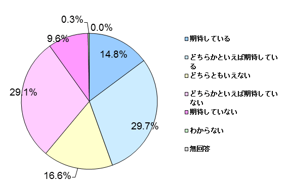 日本は経済成長の停滞、悪化する財政、少子高齢化など様々な課題に直面していますが、こうした課題に対して、日本の政党や政治家に期待しているかを尋ねたところ、「期待している」(14.8%)、「どちらかといえば期待している」(29.7%)との回答が44.5%となり、「期待していない」(9.6%)、「どちらかといえば期待していない」(29.1%)と38.7%を上回りました。
