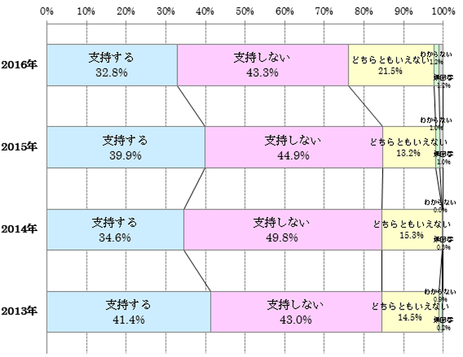 現在の安倍政権を支持するかを尋ねたところ、「支持しない」(43.3%)との回答が「支持する」(32.8%)との回答を上回る結果となりました。「不支持」が「支持」を上回るのはこれで4年連続です。