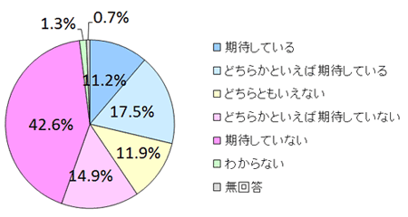 医療や介護など、高齢化社会に伴う新しい課題に対して、安倍政権が「解決に向けた方向性や解決策を打ち出すことに期待しているか」と尋ねました。「期待している」は「どちらかといえば期待してる」を加えて42.5%ありました、「期待していない」も、「どちらかといえば期待していない」を合わせると43.5%あり、有識者の間の意見は二分されています。