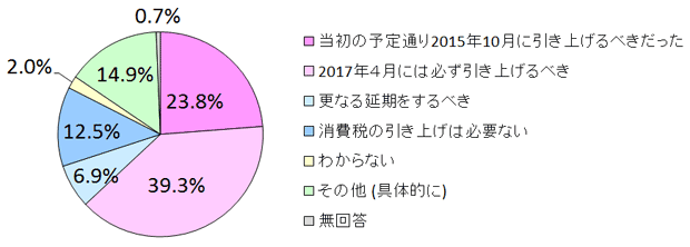一方、政府が2017年4月の実施を決定している消費税の10%への引き上げについて、最も多かった回答は「2017年4月には必ず引き上げるべき」の39.3%でと約4割となり、更なる延期を期待する声は、6.9%に過ぎませんでした。「当初の予定通り2015年10月に引き上げるべきだった」も23.8%あります。