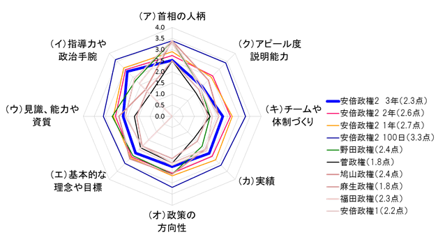 ただ、安倍政権の昨年の政権2年時点とを比較すると、「国民に対するアピール度、説明能力」が昨年の2.6点から1.9点に、また「首相としての見識、能力や資質」が2.6点から2.2点と大きく低下しています。