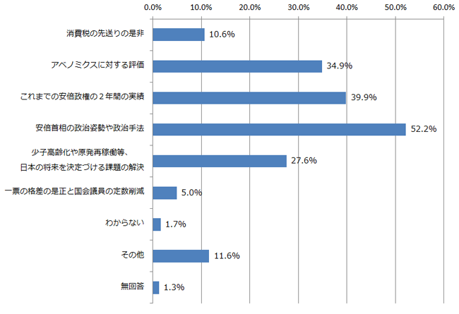 次に、今回の選挙では何が問われることになるかを尋ねたところ、「安倍首相の政治姿勢や政治手法」が52.2%と5割を超えて最多となり、「これまでの安倍政権の2年間の実績」(39.9%)、「アベノミクスに対する評価」(34.9%)、「少子高齢化や原発再稼働等、日本の将来を決定づける課題の解決」(27.6%)が続きました。首相が信を問おうとしている「消費税の先送りの是非」は10.6%に過ぎませんでした。