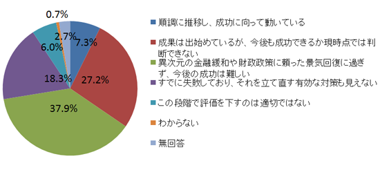 この2年間、安倍政権が推し進めてきた「アベノミクス」の評価については、「順調に推移し、成功に向って動いている」との回答は7.3%に過ぎず、「異次元の金融緩和や財政政策に頼った景気回復に過ぎず、今後の成功は難しい」との回答が37.9%で最多となり、「すでに失敗しており、それを立て直す有効な対策も見えない」の18.3%を合わせると、56.2%の有識者がアベノミクスの前途を悲観的に見ています。