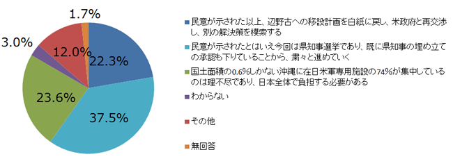 11月16日に沖縄県知事選挙が行われ、米軍普天間飛行場の名護市辺野古への移設に反対する翁長雄志・前那覇市長が当選しました。この結果を受け、普天間飛行場の移設についての考えを尋ねたところ、「民意が示されたとはいえ今回は県知事選挙であり、既に県知事の埋め立ての承認も下りていることから、粛々と進めていく」という政府方針と同様の回答が37.5%で最多となりました。