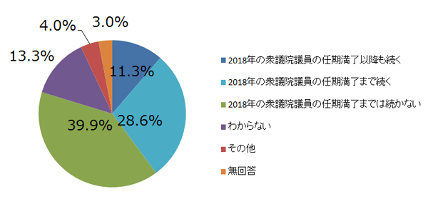 仮に今回の選挙で自民党が勝利した場合、安倍政権はいつまで続くのか、安倍政権の将来の見通しについて尋ねたところ、「2018年の衆議院議員の任期満了までは続かない」との見方が39.9%で最多となり、これに「2018年の衆議院議員の任期満了まで続く」(28.6%)が続いています。一方、「2018年の衆議院議員の任期満了以降も続く」との見方は11.3%にとどまりました。有識者は安倍政権は最長でも「あと4年」と見ています。