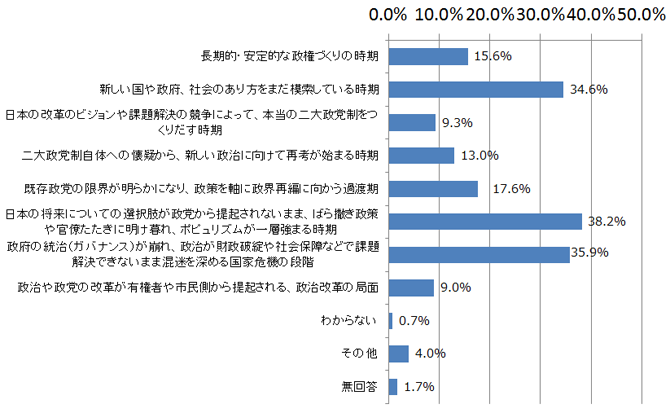 最後にアンケートでは、日本の政治の現状について、どのように判断しているか尋ねました。これに対して、「日本の将来についての選択肢が政党から提起されないまま、ばら撒き政策や官僚たたきに明け暮れ、ポピュリズムが一層強まる時期」が4割近くに上り、最多となりました。過去2回のアンケートで最多だった「新しい国や政府、社会のあり方をまだ模索している時期」は3番目にとどまり、有識者の間で日本政治の現状に対して厳しい見方が広がっています。