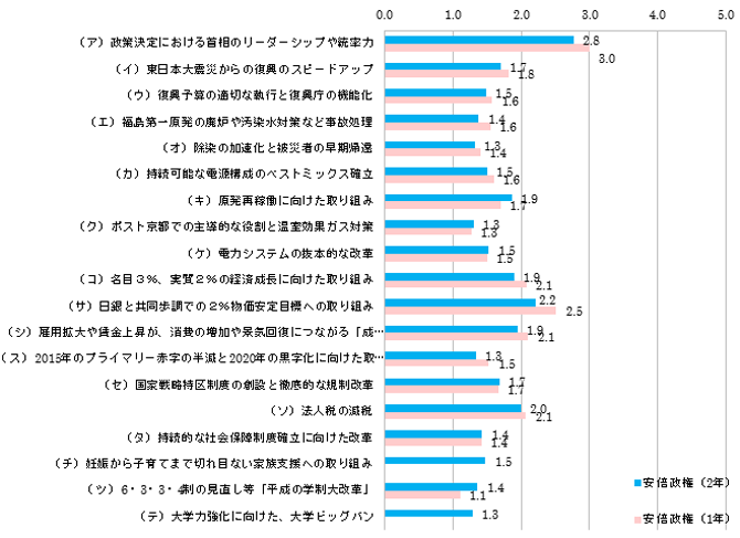 一方、これまで安倍政権が打ち出した政策や政権対応の38項目のそれぞれに対して、「うまく対応できた」(5点)、「うまく対応できていないが、今後期待できる」(3点)、「対応できておらず、今後も期待できない、あるいは、進め方に問題があり、賛同できない」(1点)で、有識者に評価してもらったところ、平均点は1年目時点と同じ1.8点でした。