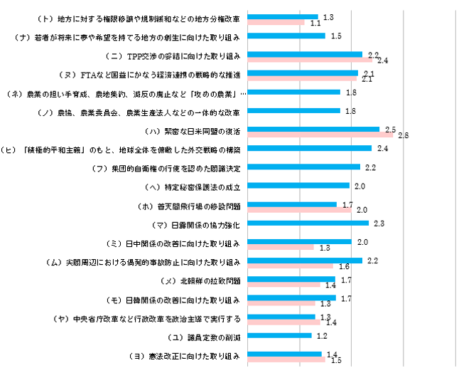 これに対して最も評価が低かった項目は、2012年の衆議院解散の際、当時の民主党・野田佳彦首相と自民党・安倍総裁の間で約束がなされた「議員定数の削減」(1.2点)でした。この他に1点台前半を記録したものは、「廃炉と汚染水対策」、「除染」、「温室効果ガス対策」、「財政再建」、「持続的な社会保障制度」、「教育」、「地方」、「行政改革」、「憲法改正」などがあり、分野が多岐にわたっています。