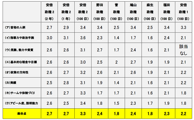 首相としての資質を、「説明能力」、「チームや体制作り」、「実績」、「指導力や政治手腕」、「見識、能力や資質」、「基本的な理念や目標」、「政策の方向性」、「首相の人柄」の8項目を5点満点で見たときの平均は2.7点となり、1年時点と同じでした。