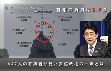 安倍政権は2013年12月26日に発足後1年を迎えようとしています。言論NPOでは政権実績評価の一環として2006年の安倍政権から、有識者を対象にアンケートを行い、その結果を公表しています。