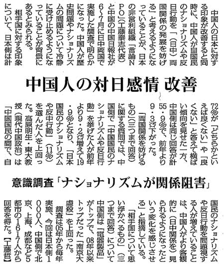 2010/08/15 毎日新聞 毎日jp 中国人:対日感情、改善 意識調査「ナショナリズムが関係阻害」