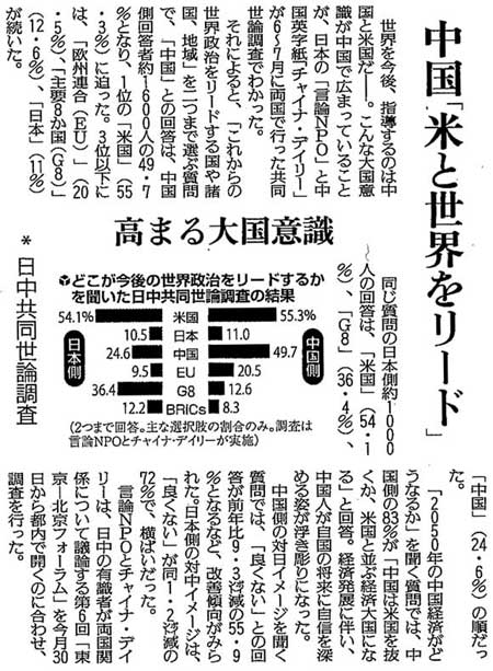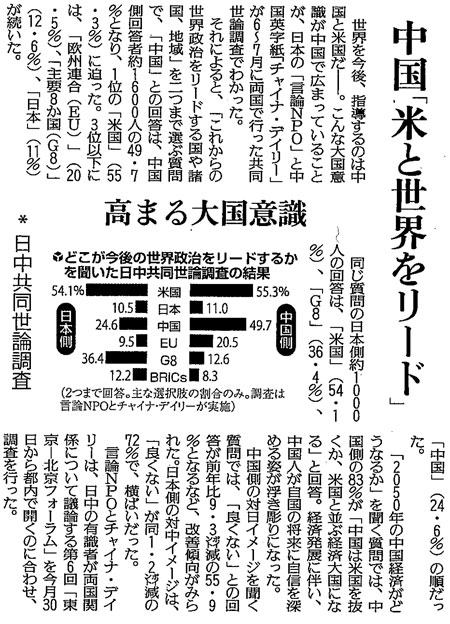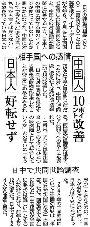 2010年8月15日、主要各紙に「日中共同世論調査結果」が掲載されました。