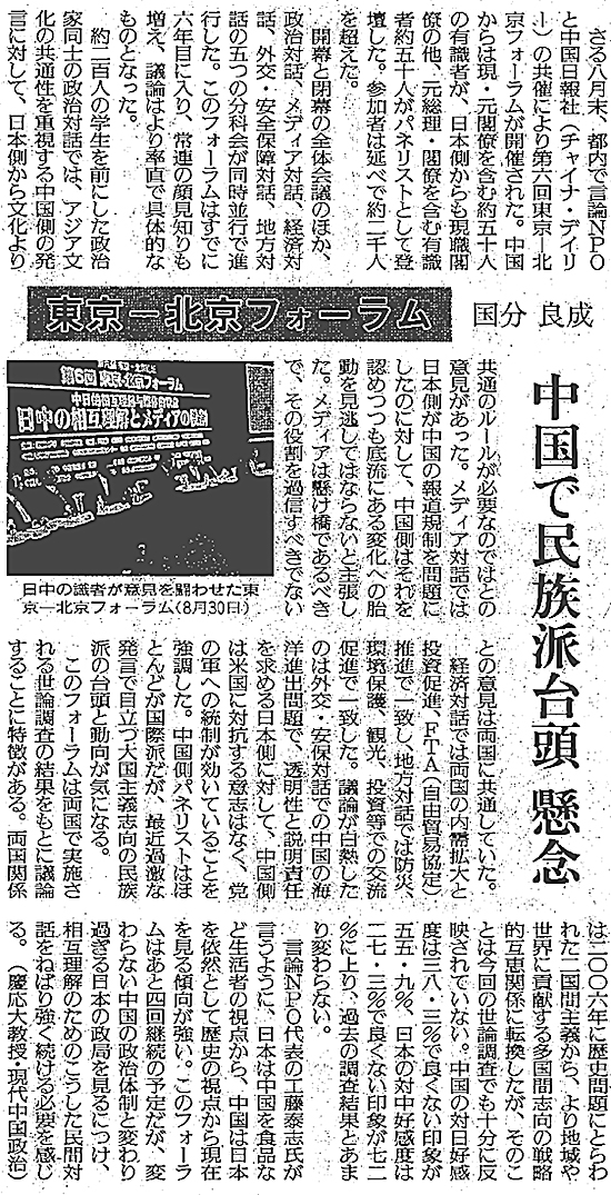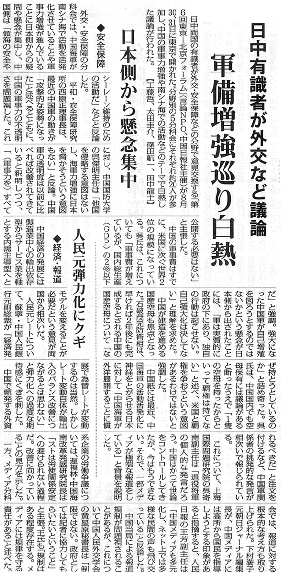 日中両国の有識者が外交・安全保障などの分野で意見交換する「第6回 東京‐北京フォーラム」(言論NPO、中国日報社主催)が8月30、31日に東京で開かれた。
