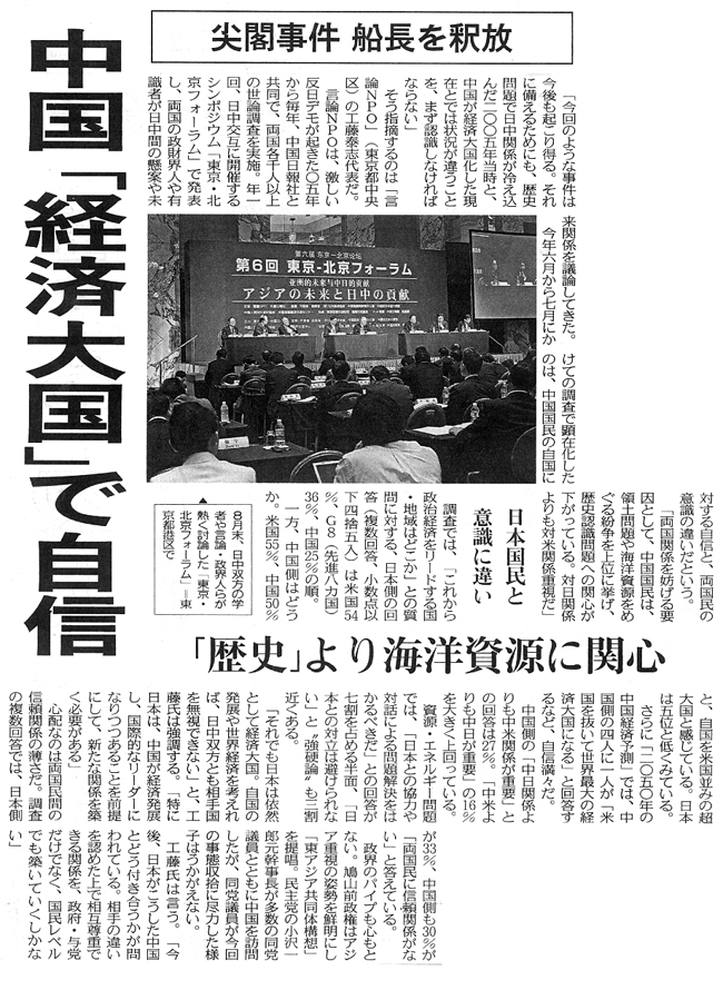 中国「経済大国」で自信 ― 尖閣事件 船長を釈放