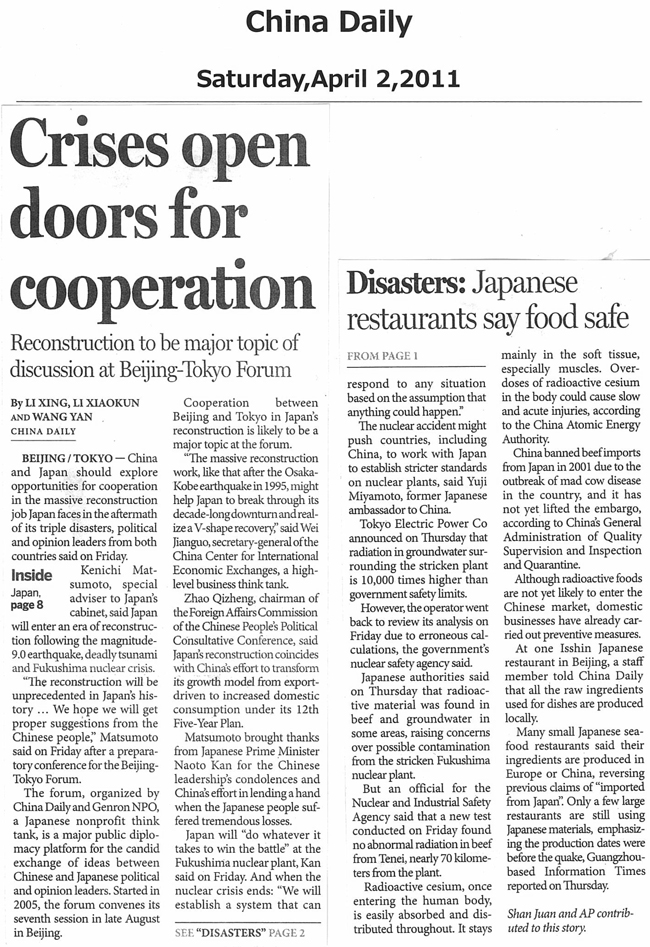 Reconstruction to be major topic of discussion at Beijing-Tokyo forum
