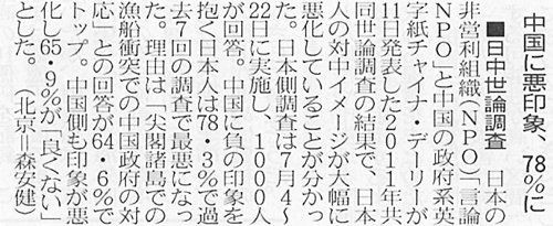 「<世論調査>日中ともに好感度が低下、尖閣諸島問題や福島原発事故が影響」