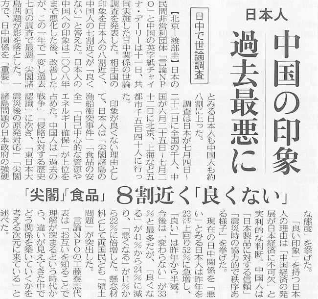 「日中世論調査、互いの印象「良くない」最多に 尖閣問題が影響」