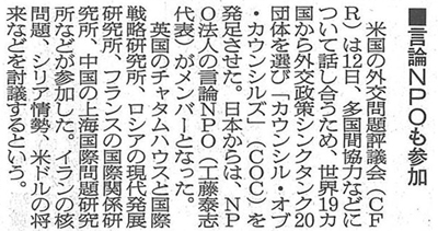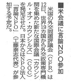 【毎日新聞】米会議に言論NPO参加 / 【朝日新聞】言論NPOも参加