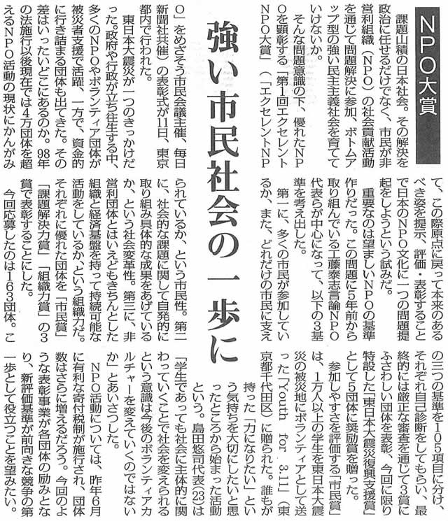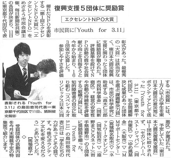 優れたNPOを表彰する「第1回エクセレントNPO大賞」(「エクセレントNPO」をめざそう市民会議主催、毎日新聞社共催)の各賞が決まり、11日に東京都千代田区で表彰式があった。