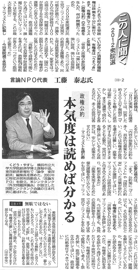 【西日本新聞】この人に聞く2012衆院選 本気度は読めばわかる