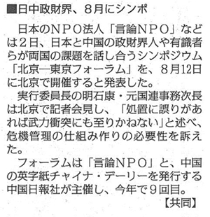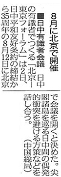 【毎日新聞】日中政財界、8月にシンボ / 【日経新聞】8月に北京で開催 日中有識者会議