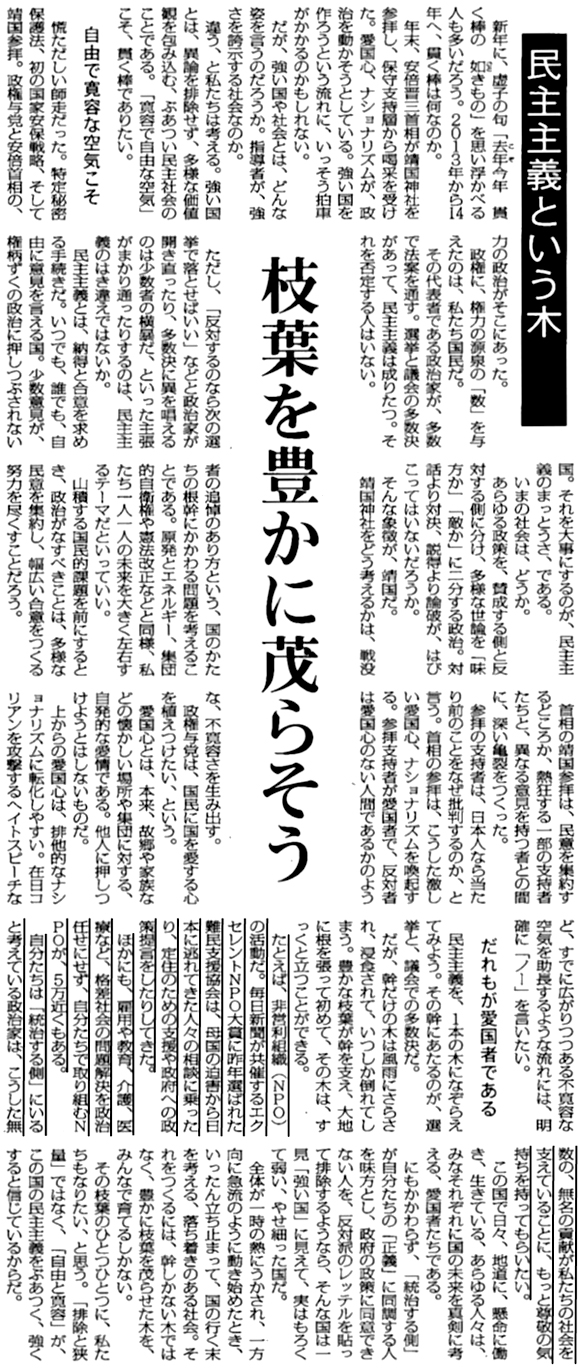 【毎日新聞】社説 民主主義という木 枝葉を豊かに茂らそう