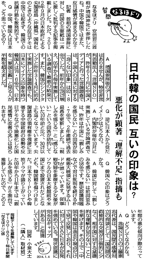 【毎日新聞】「なるほドリ」日中韓の国民印象は?悪化が顕著『理解不足』指摘も