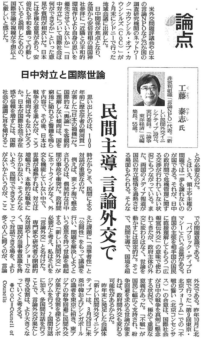 【読売新聞】論点 日中対立と国際世論 民間主導 言論外交で