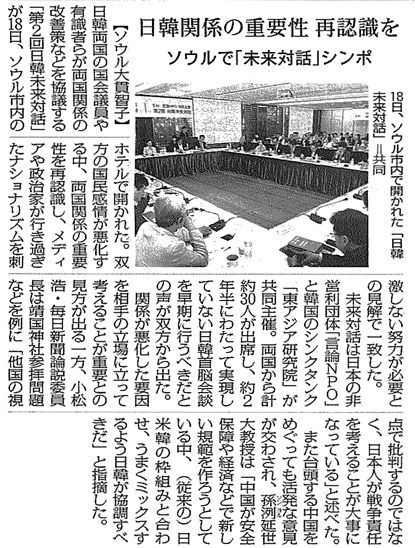 【毎日新聞】日韓関係の重要性 再認識を ソウルで『未来対話』シンポ