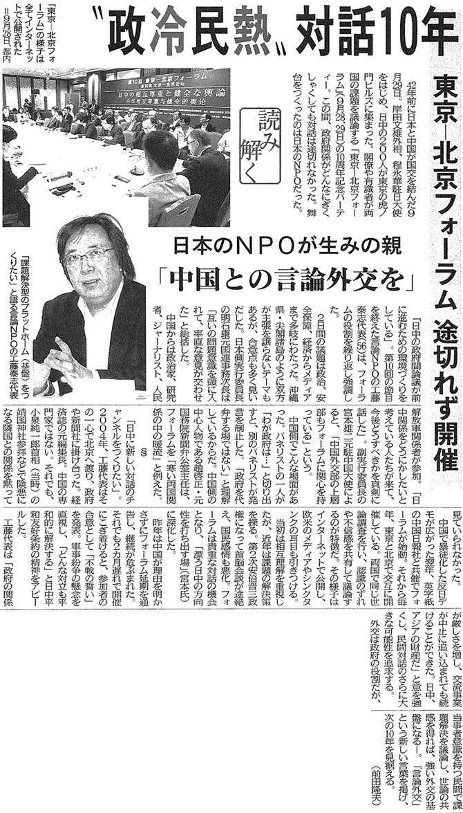【西日本新聞】"政冷民熱"対話10年 東京―北京フォーラム途切れず開催 日本のNPOが生みの親『中国との言論外交を』