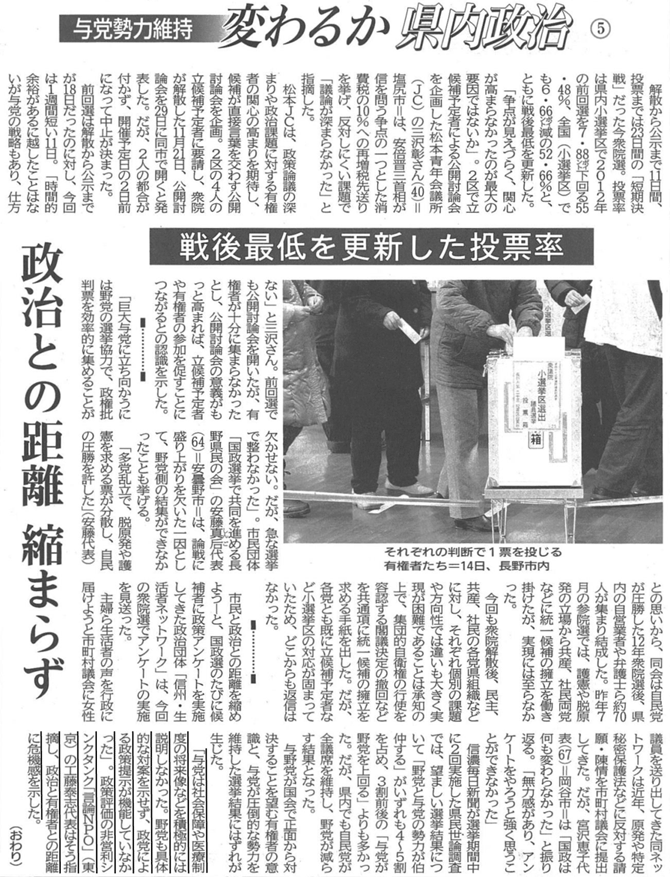 【信濃毎日新聞】「戦後最低を更新した投票率 政治との距離 縮まらず