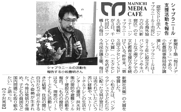 【毎日新聞】エクセレントNPO大賞受賞団体、シャプラニールが講演会を開催