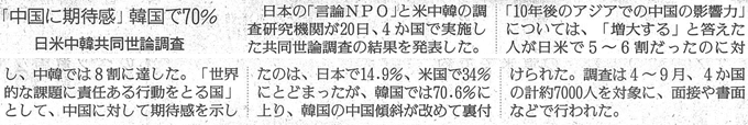 【読売新聞】『中国に期待感』韓国で70% 日米中韓共同世論調査