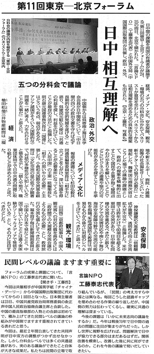 【毎日新聞】第11回東京-北京フォーラム 日中相互理解へ