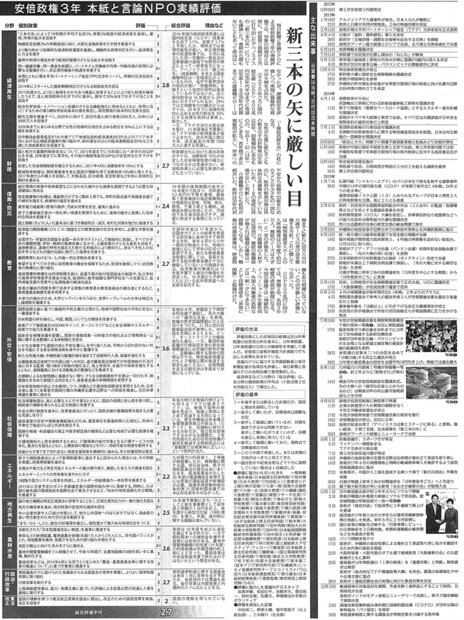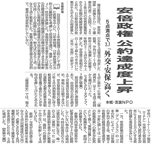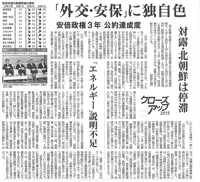 【毎日新聞】安倍政権 公約達成度上昇 ―5点満点で2.7「外交・安保」高く