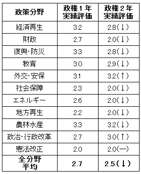 認定NPO法人 言論NPO(東京都中央区日本橋、代表:工藤泰志)は、12月14日投開票の衆議院選挙に向け、安倍政権の2年時点における「政権実績評価」を行い、その結果を本日12月1日に発表いたしました。総合評価は5点満点中2.5点となり、昨年実施した安倍政権1年時点での総合評価2.7点より、0.2ポイント下がりました。アベノミクスで注目される「経済再生」の分野は、現時点で成果を判断できないことが点数を押し下げ、昨年の3.2点から、今年は2.8点に下がりました。