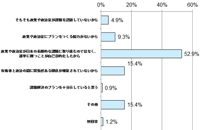 政党や政治家が日本の課題解決のプランを示せない原因を尋ねたところ、「政党や政治家が日本の長期的な課題に取り組むのではなく、選挙に勝つことが自己目的化したから」との回答が52.9%と過半数を超え、多くの有識者が政党や政治家の多くが選挙に勝つことが自己目的化していると感じていることが明らかになりました。
