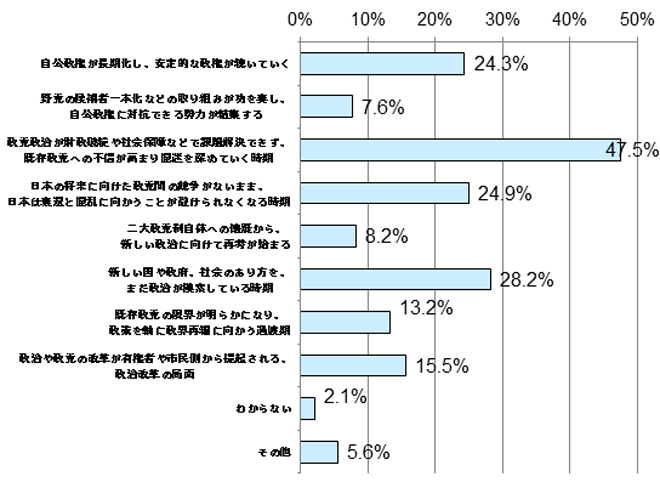 今の日本の政治状況について、半数に迫る47.5%の人が「政党政治が財政破綻や社会保障などで課題解決できず、既存政党への不信が高まり混迷を深めていく時期」と回答しており、既存政党への不信を示し始めていることが明らかになりました。これに「新しい国や政府、社会の在り方をまだ政治が模索している時期」(28.2%)、「日本の将来に向けた政党間の競争がないまま、日本は衰退と混乱に向かうことが避けられなくなる時期」(24.9%)との回答が続きました。