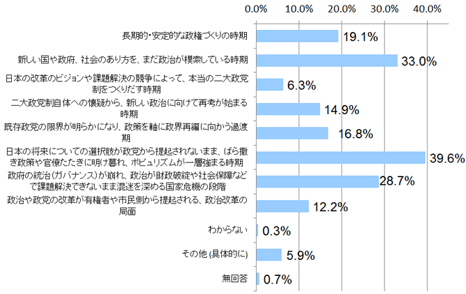 今の日本の政治の現状をどのように判断しているか、8つの選択肢から2つまで選んでもらったところ、最も多いのは昨年の2年時点に続いて「日本の将来についての選択肢が政党から提起されないまま、ばら撒き政策や官僚たたきに明け暮れ、ポピュリズムが一層強まる時期」で39.6%と4割近くになりました。続いて多いのは、「新しい国や政府、社会にあり方をまだ政治が模索している時期」の33%です。日本の将来に対する変化を感じながらも、政党政治の課題解決の力への不信が依然高いことが浮き彫りになっています。