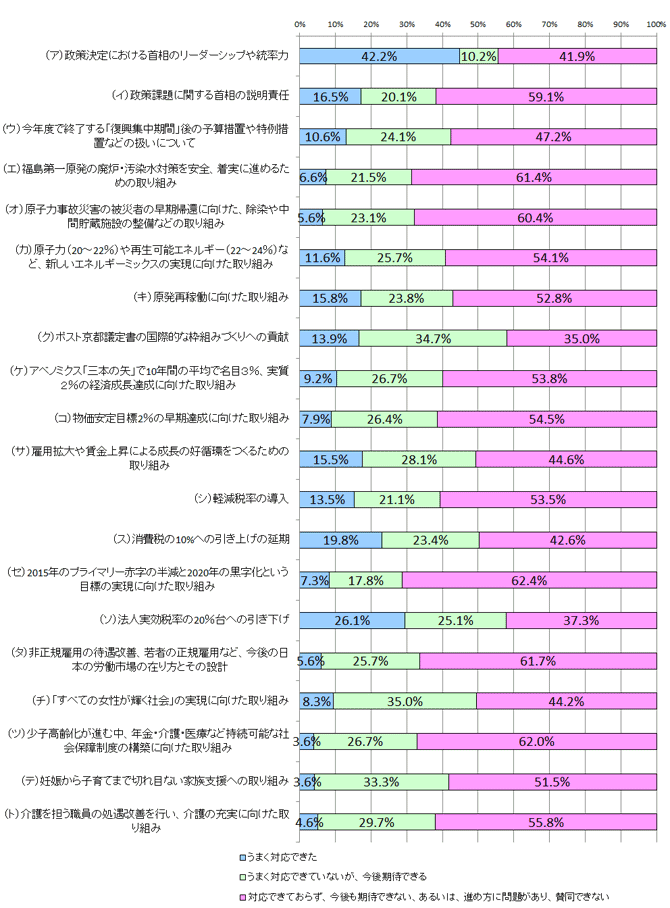 次に、安倍政権が打ち出した主要40項目の政策について、「うまく対応できた」「うまく対応できていないが、今後期待できる」「対応できておらず、今後も期待できない。あるいは、進め方に問題があり、賛同できない」の3つの選択肢から選ぶ形式で、有識者に評価してもらいました。