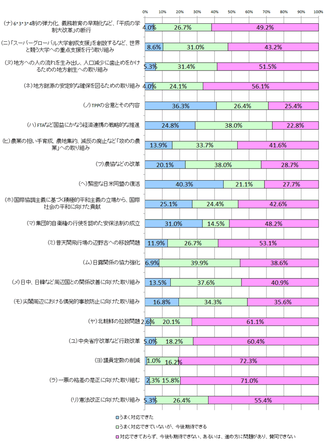 安倍政権がこの3年に進めた主要政策40項目のうち、「うまく対応できた」「今後も期待できる」が5割を超えたのは「日米同盟」「TPP」「FTA」等の8項目だが、政治改革、財政、社会保障、などの計21項目では、「今後も期待できない」が5割が越えている。