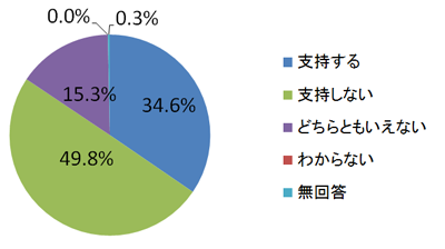 2年が経とうとしている現在の安倍政権を支持するか尋ねたところ、「支持する」という回答は、34.6%となりました。100日時点では53.1%と5割を超えていましたが、1年目時点で41.4%と10ポイント以上の大幅減となり、今回はそこからさらに減少しています。