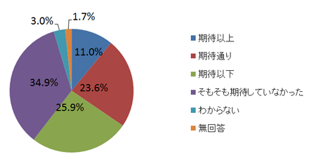 また、発足時に抱いていた期待と比べて、今の安倍政権をどう思うか尋ねたところ、最も多かった回答は「そもそも期待していなかった」の34.9%(100日時点では23.9%、1年時点では34.9%)でした。それに続くのは「期待以下」(25.9%)との回答で、1年目時点の14.8%から10ポイント以上増加しました(100日時点では3.2%)。この「期待以下」と「そもそも期待していなかった」を合計すると、60.8%(100日時点では27.1%、1年時点では49.7%)の有識者が否定的な評価をしていることになります。