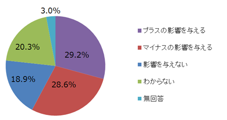 次に、11月に安倍首相は消費税の10%への引き上げを先送りし、2017年4月に消費税を引き上げることを表明しました。この先送りが、今後のアベノミクスの展開にどのような影響をもたらすと思うか尋ねたところ、「プラスの影響を与える」が29.2%、「マイナスの影響を与える」が28.6%と拮抗し、有識者の見方は分かれています。「影響を与えない」は18.9%でした。