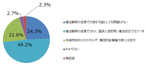 安倍政権は集団的自衛権について、歴代内閣が「憲法上許されない」としてきた憲法解釈を、「憲法上許容される」と変更する閣議決定を行い、集団的自衛権の行使を認めました。こうした手続きの進め方の是非について尋ねたところ、「憲法解釈の変更ではなく、国民に信を問い憲法改正で行うべき」が49.2%と5割に迫っています。一方、「憲法解釈の変更で行使を可能としても問題はない」と政府の進め方に賛成する見方は24.3%にとどまりました。また、「手続き如何にかかわらず、集団的自衛権行使には反対」との回答も21.6%と2割程度見られました。