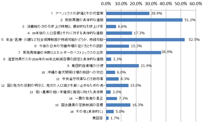 今回の選挙で、日本の政党が国民に対して最低限説明しなくてはならない日本の課題は何かを尋ねたところ、「年金・医療・介護など社会保障制度が持続可能かどうか、持続可能でない場合の代替策」(52.5%)と、「財政再建の具体的な道筋」(51.2%)の2つが5割を超えました。