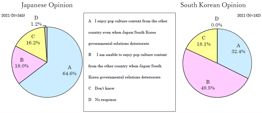 Narrowing down the Japanese responses to those who "enjoy South Korean pop culture immensely," we find that 77.5% have a good impression of South Korea. In addition, 64.6% of Japanese respondents stated that even if the relationship between the countries were to continue to deteriorate, they would remain enthusiastic fans of K-pop. A similar trend can be seen in South Korea as well, with 55% of those who "enjoy J-pop immensely" stating that they have a good impression of Japan.